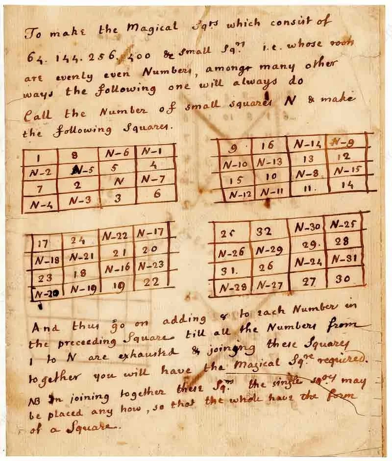 • Franklin's magic squares. 18th Century document by Benjamin Franklin, describing the method for making 'magical squares'. A magic square is an arrangement of numbers in a square grid, where the numbers in each row and each column, and the numbers in the main and secondary diagonals, all add up to the same number.