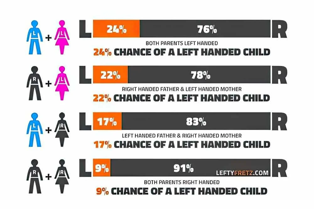 If your father was left-handed but your mother was right-handed, you have a 17% chance of being born left-handed, while two right-handed parents will have a left-handed child only 9-10% of the time.