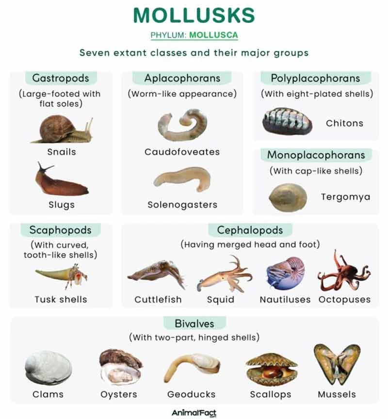 Mollusk – a soft-bodied animal like a snail, clam, or octopus