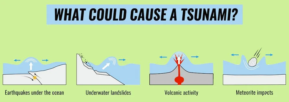 So can landslides that happen underwater or near the coast. Even something very large falling into the ocean—like a meteorite—can create a tsunami. These events are rare, but they show that there is more than one way a tsunami can begin.