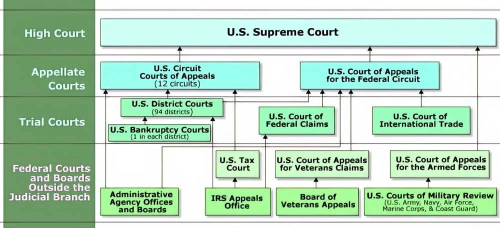 The highest court—the Supreme Court—settles disputes among states, hears appeals from other courts, and decides if federal laws are constitutional.