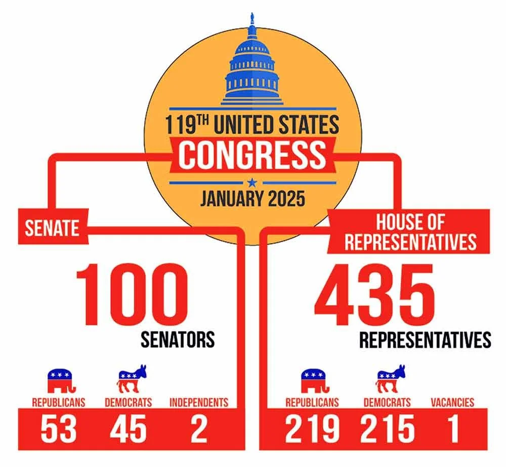 The legislative branch is made up of 100 U.S. Senators and 435 members in the U.S. House of Representatives.