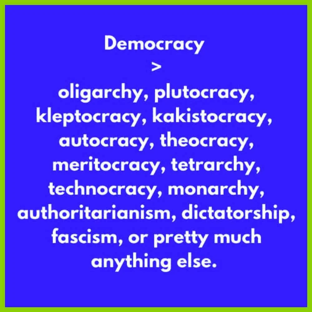 When working correctly, democracies help a society be freer and more stable by protecting against corruption and abuse of power. This is done through regular, free, and fair elections, term limits, and strong law-making bodies and courts.