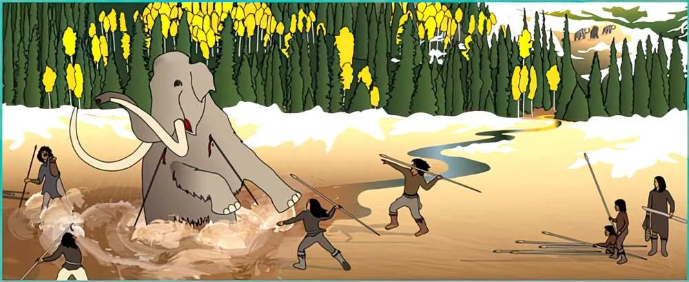 The Paleoindians were early people who hunted animals and gathered plants. They were called hunter-gatherers. They moved around in small groups, usually with about 30 to 50 people. They hunted huge animals like mammoths and mastodons, as well as deer, moose, and bears.