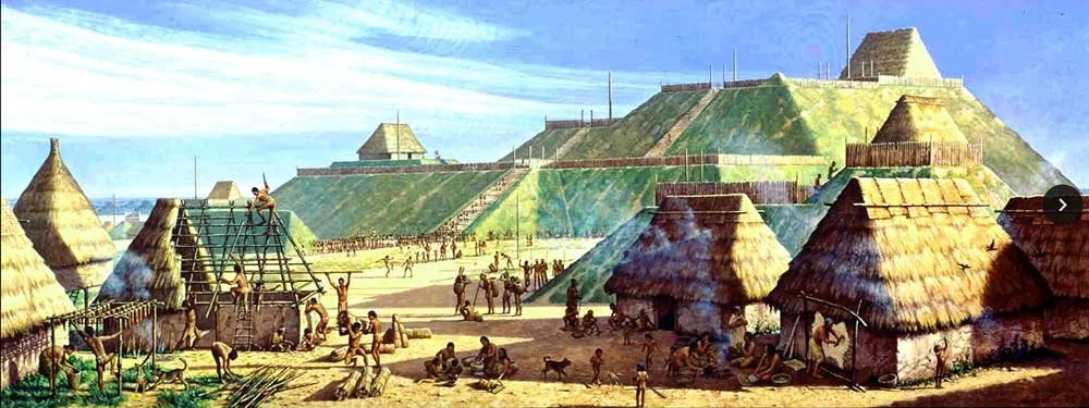 At its peak, Cahokia had tens of thousands of people and over 100 earth mounds. The largest, Monks Mound, is about 100 feet tall!