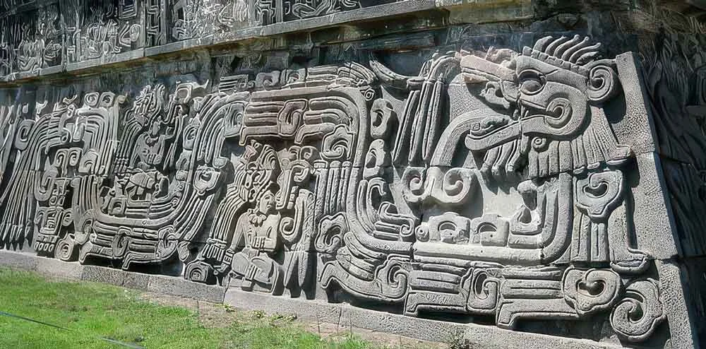 Another site, Teopantecuanitlan, all the way in the modern state of Guerrero, has a ceremonial sunken court flanked with an Olmec-style were-jaguar depiction of the maize god.