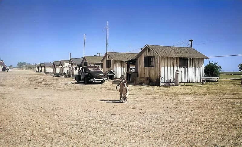 • California: Workers’ houses, circa 1930. Original black & white photo colorized.