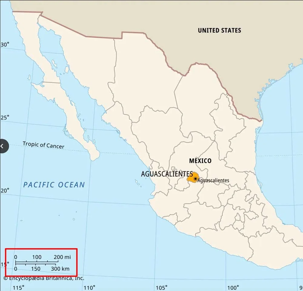 Look at the map highlighting where Aguascalientes is located. Use the legend — bottom right, inside the red rectangle — to estimate how far it is from Aguascalientes to Mexicali. Give your answer in both miles and kilometers.