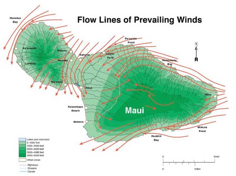 Air swept inland on the trade winds is redirected by the mountains, valleys, and vast open slopes.