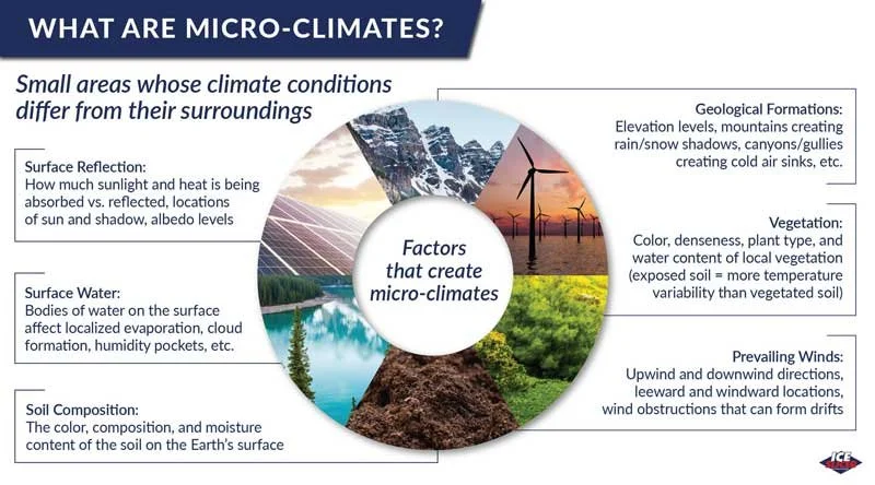 Local climates can vary greatly based on such factors as elevation, moisture, wind, soil, and vegetation.