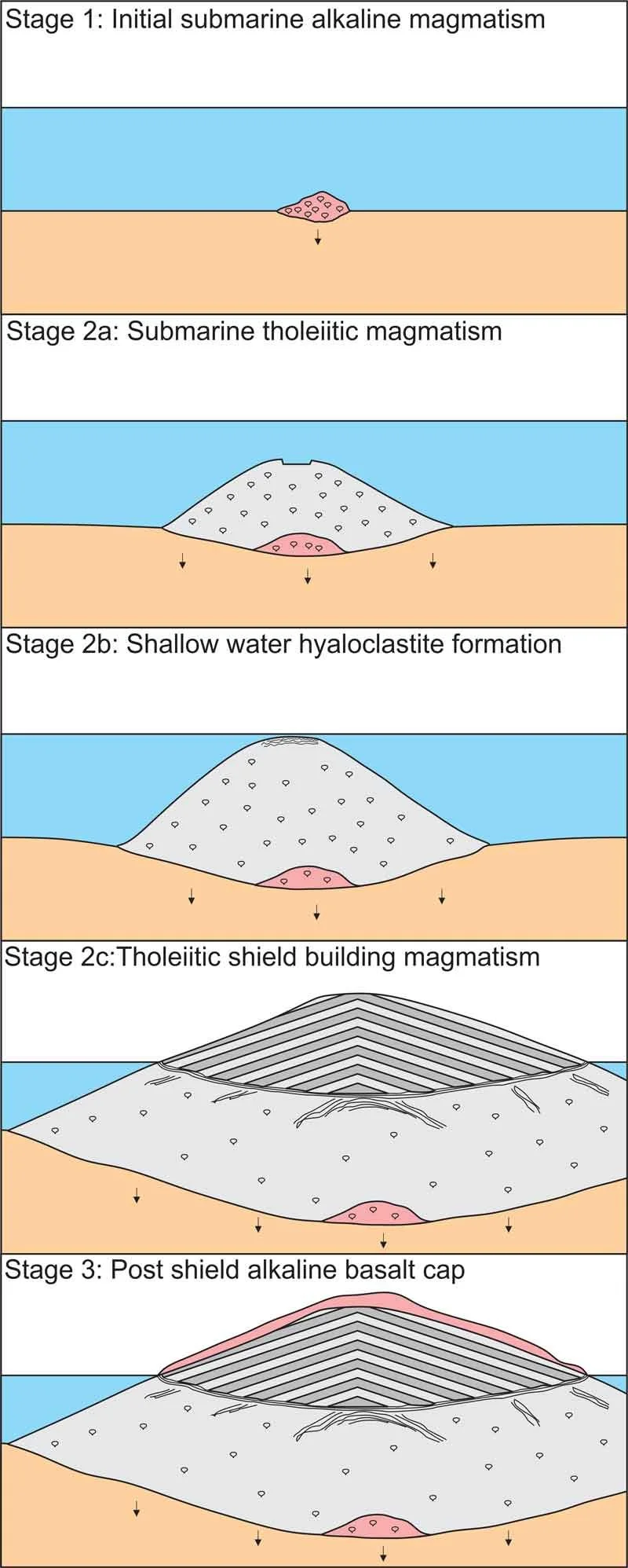 Upon reaching shallow depths, a series of shallow explosive eruptions occurred, building a plateau out of ash and lava that the subsequent island would expand upon.